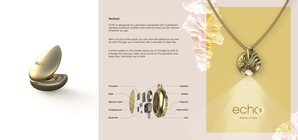 Teknologien i ECHO gør at billeder og video kan projekteres op ved hjælp af en lille projekter indeni. Den indeholder desuden mulighed for at kunne afspille lyd enten gennem smykket eller ved brug af bluetooth funktionen. Den indeholder derudover RAM, Memory kort, processor, en knap i form af en perle og selvfølgelig et batteri.