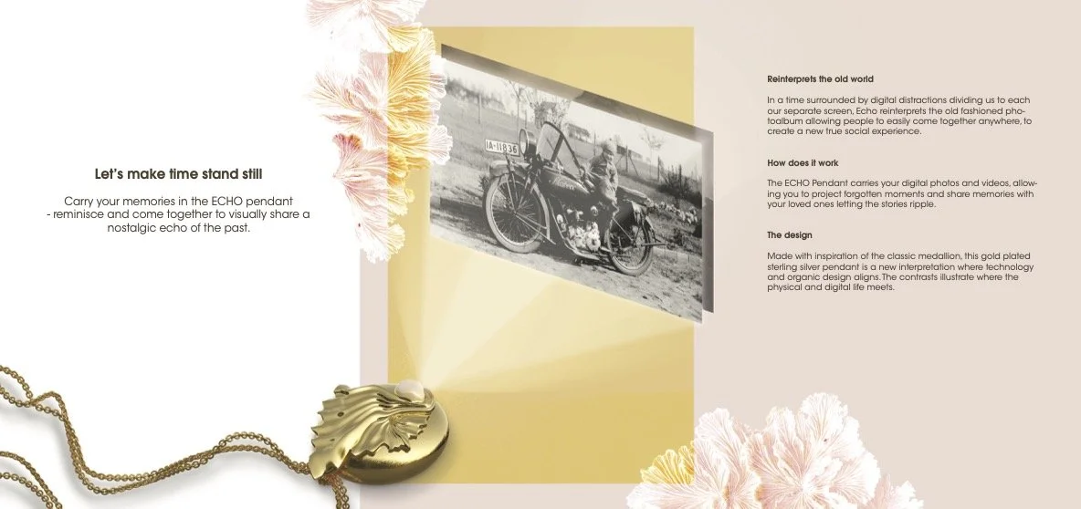 ECHO vedhænget giver dig mulighed for at bære dine billeder og videoer og gennem en projektion at kunne genfinde fælles minder.