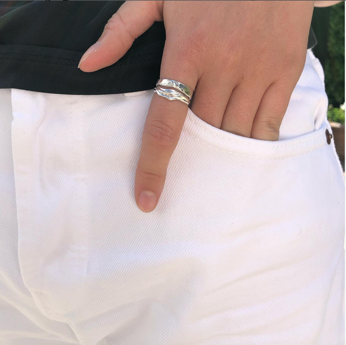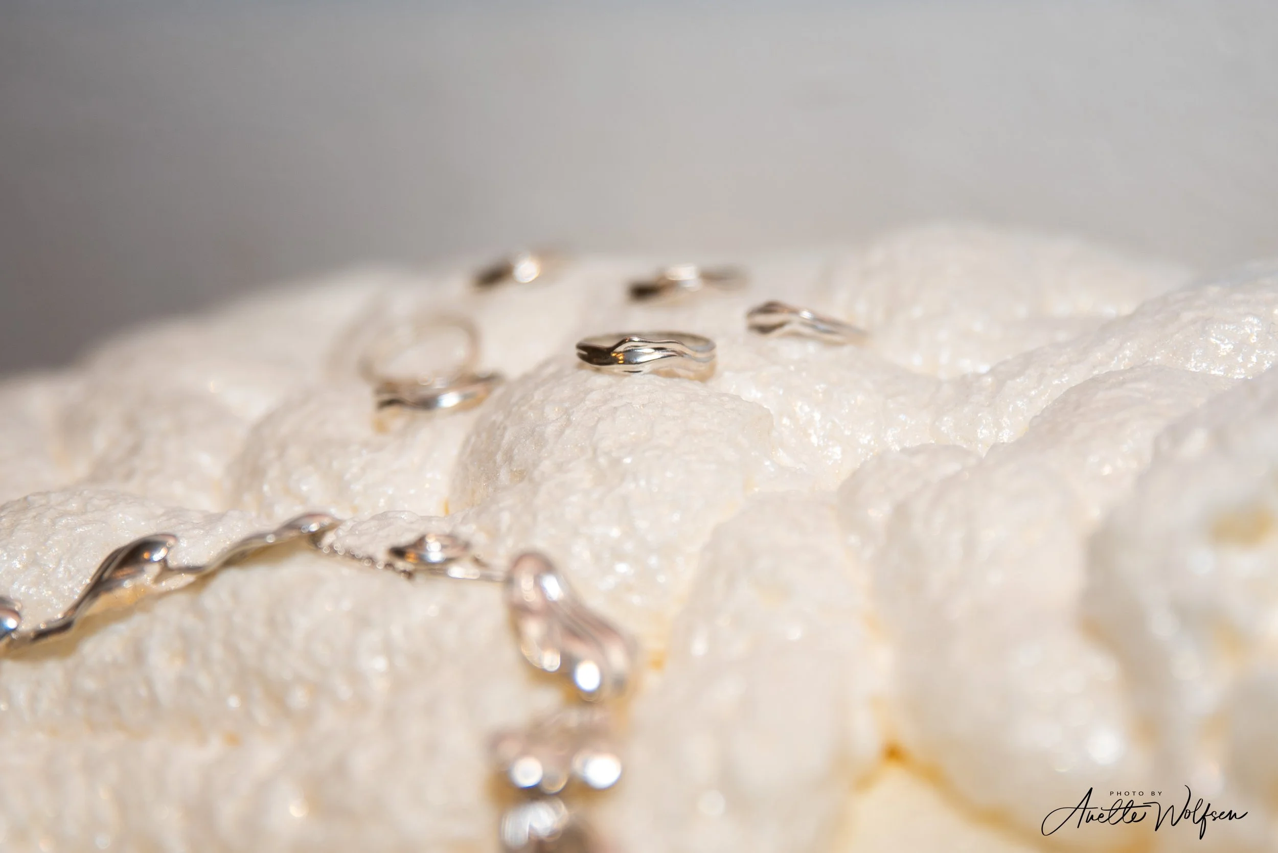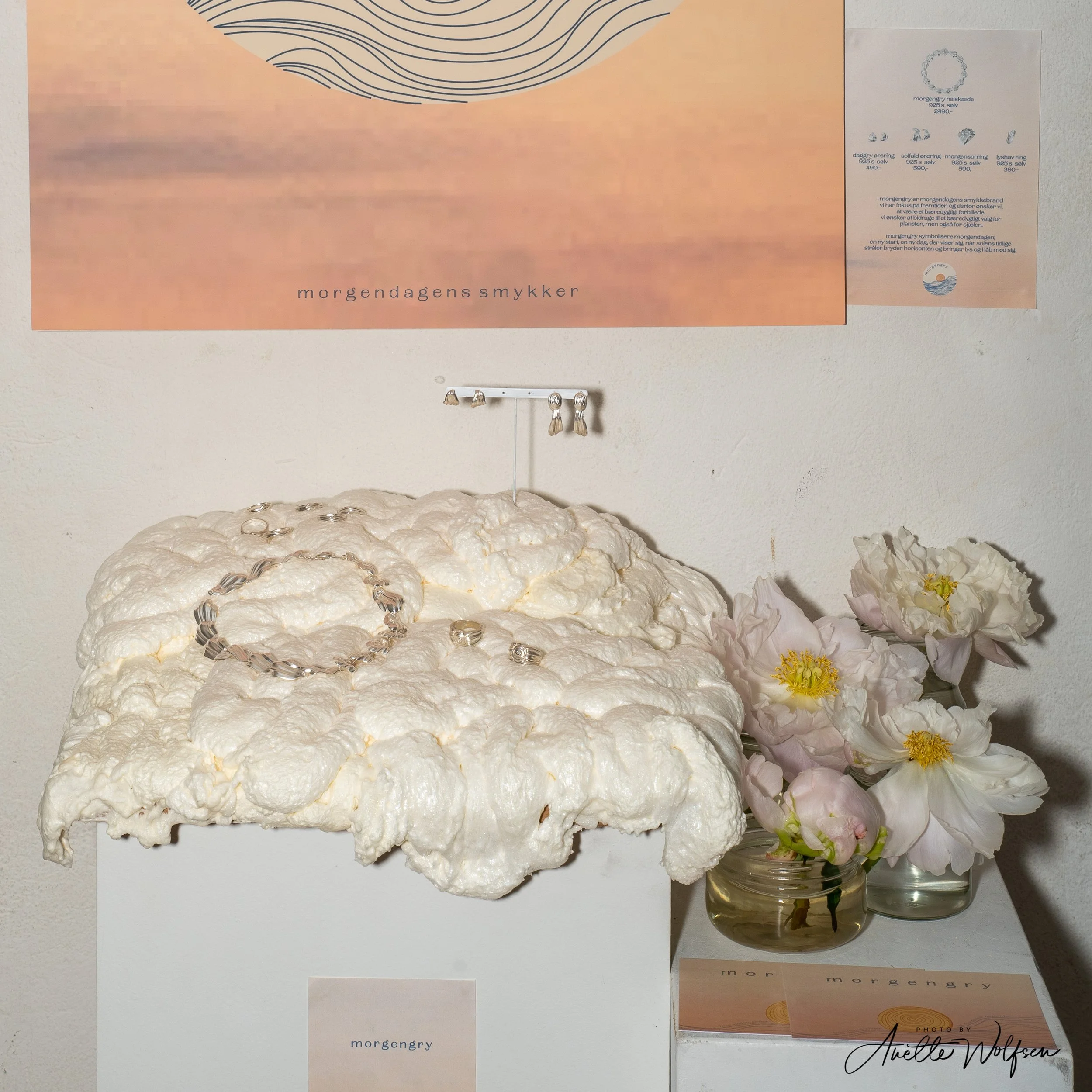 Morgengry kollektion omfatter to ringe, to øreringe og en halskæde, der fungere som showpiece og stjernen i kollektionen. Vi valgte have skabe en forholdsvis lille kollektion produceret i sterling sølv. Vores ønske var at skabe holdbare smykker indenfor slow fashion og en stor del af vores produktion var derfor baseret på bestillinger.